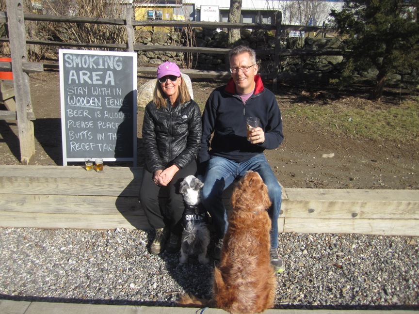 Back on the patio, Cass Anderson and Steve Murphy of Sleepy Hollow are seated on a bench, faces up to the sun, playing with dogs Lucy and Ruby. They took the dogs for a walk, and Cass even got in some paddle, as platform tennis is known, before hitting Captain Lawrence for a well-deserved beverage.
